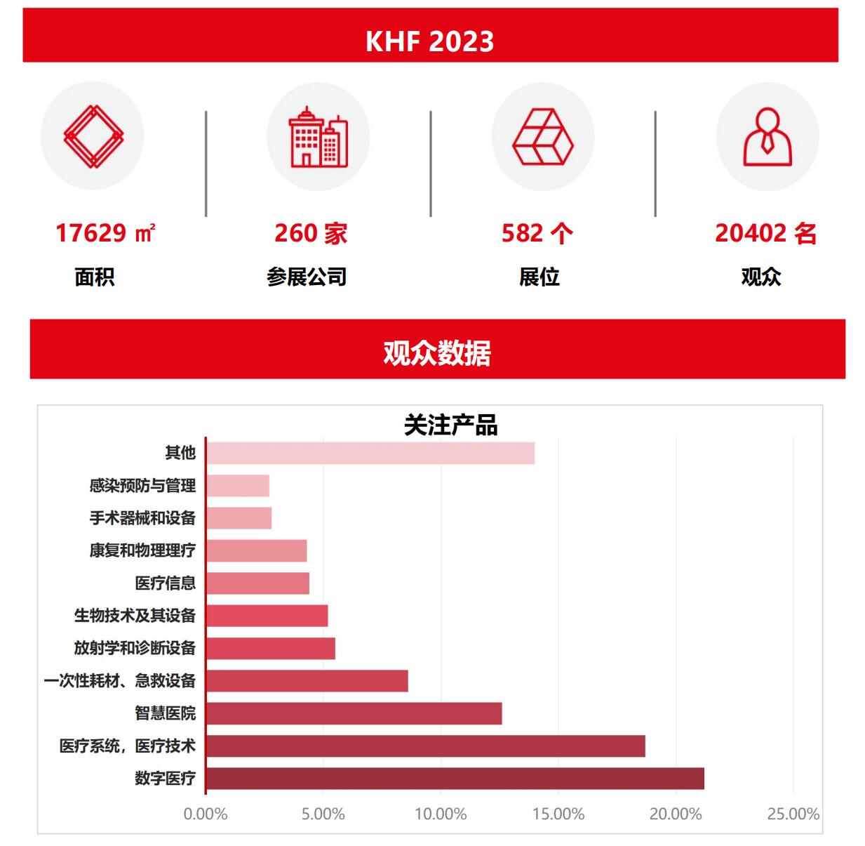2023 年 KHF 展會(huì)展覽面積 17629 平方米260 + 家展商吸引了 20402 位來自世界各地的醫(yī)療領(lǐng)域行業(yè)的觀眾來到展會(huì)現(xiàn)場(chǎng)。