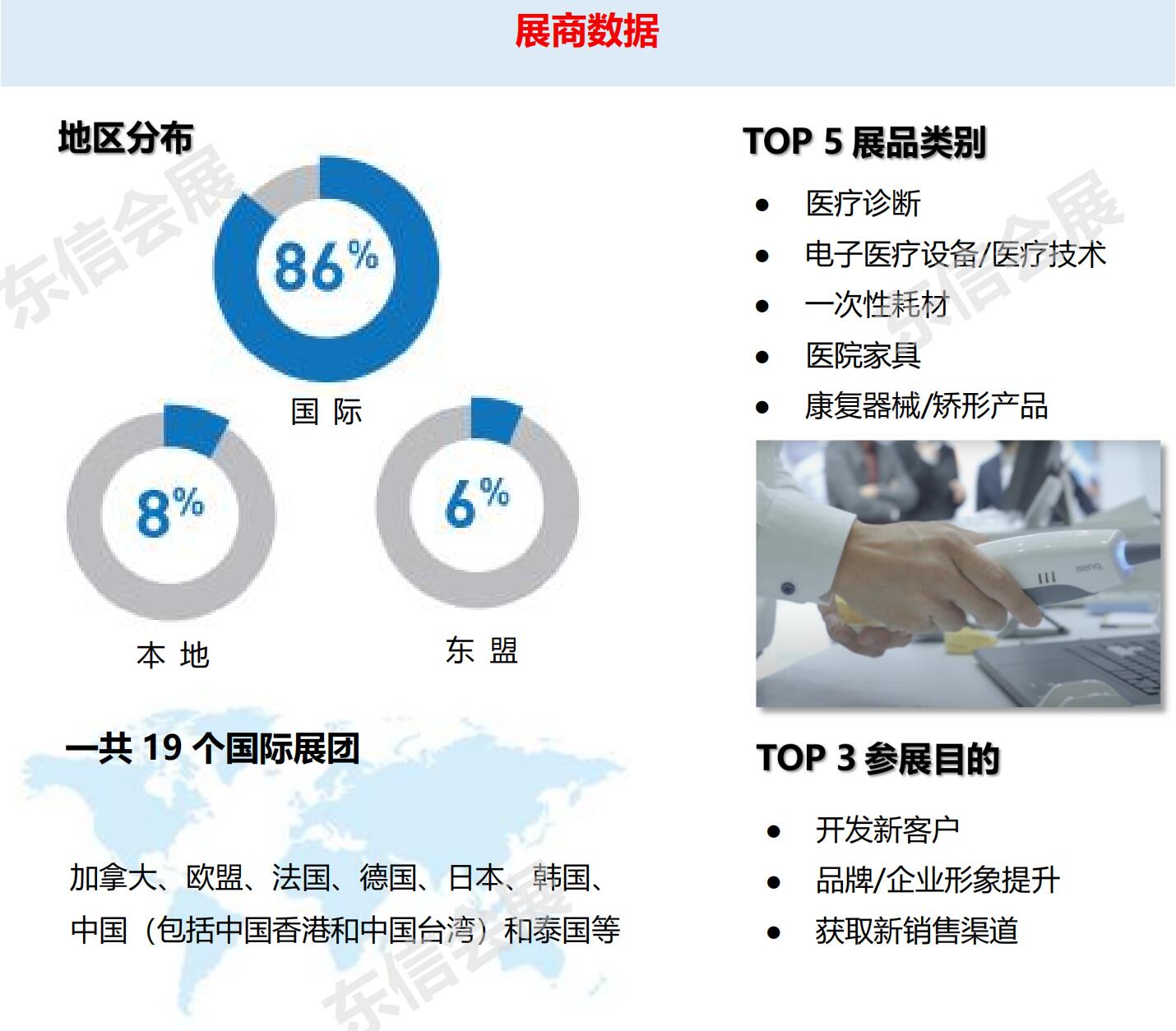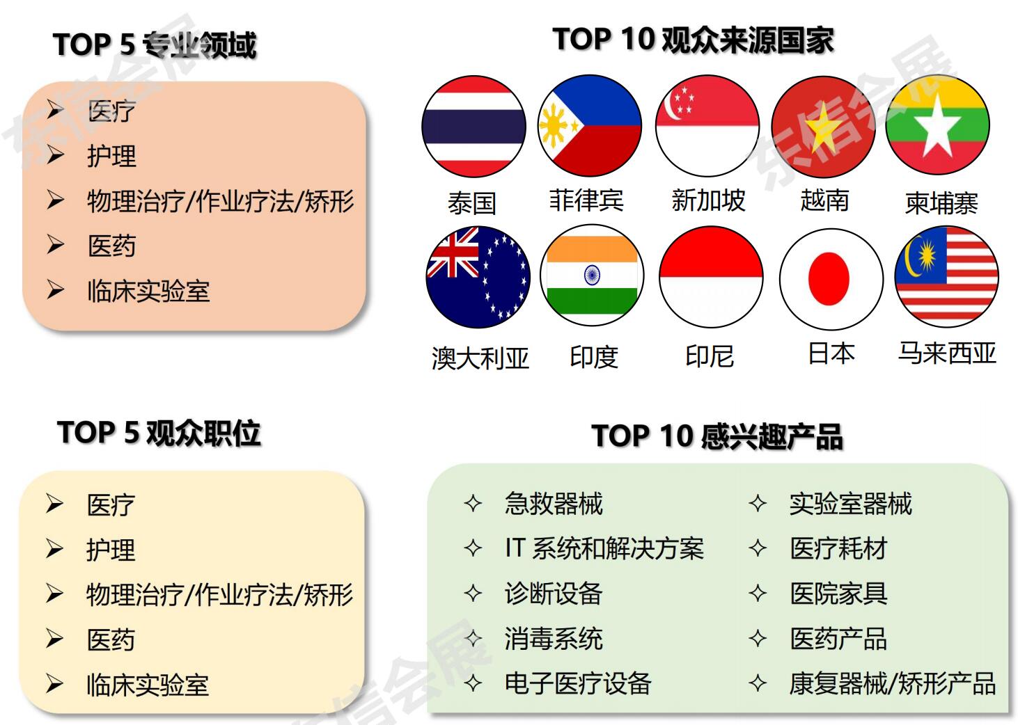 急癥室設(shè)備;建筑技術(shù)與服務(wù);通信與信息技術(shù);牙科設(shè)備及用品;診斷、消毒和處理系統(tǒng);電子醫(yī)療儀器、醫(yī)療技術(shù);餐飲及廚房設(shè)備;面料、洗衣;醫(yī)療家具及設(shè)備;實(shí)驗(yàn)室設(shè)備;醫(yī)用耗材;眼科用品;康復(fù)器材、骨科耗材;醫(yī)藥用品;服務(wù)與刊物。