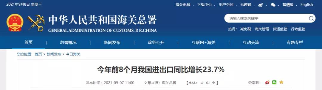 單看8月份,我國外貿進出口3.43萬億元,增長18.9%。其中,出口1.9萬億元,增長15.7%;進口1.53萬億元,增長23.1%。