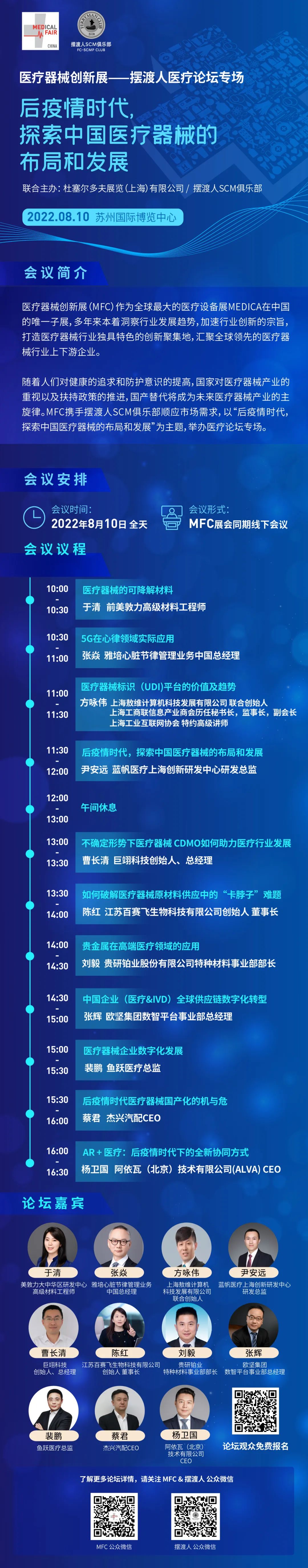MFC 2022 展會(huì)同期還將舉辦擺渡人醫(yī)療論壇和FTR4H數(shù)字醫(yī)療論壇,論壇將邀請(qǐng)到來(lái)自美敦力、雅培、強(qiáng)生、藍(lán)帆醫(yī)療、巨翊科技、魚(yú)躍、BIX等多家醫(yī)療行業(yè)知名企業(yè)的業(yè)內(nèi)大咖進(jìn)行主題演講,內(nèi)容涵蓋醫(yī)療原材料、供應(yīng)鏈、市場(chǎng)戰(zhàn)略與布局、數(shù)字醫(yī)療等熱點(diǎn)內(nèi)容,多角度解讀醫(yī)療行業(yè)的發(fā)展現(xiàn)狀,并對(duì)未來(lái)進(jìn)行展望,為觀眾提供豐富的學(xué)習(xí)機(jī)會(huì)。擺渡人論壇議程已發(fā)布,請(qǐng)查看下圖詳情。