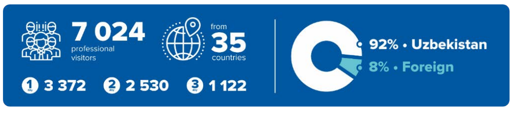 2023年共有超過(guò)250家公司參與了TIHE,其中45%是烏茲別克斯坦本土企業(yè),還有55%是來(lái)自孟加拉國(guó)、白俄羅斯、中國(guó)、捷克、丹麥、德國(guó)、印度、意大利、哈薩克斯坦、韓國(guó)、俄羅斯、土耳其、烏克蘭等的國(guó)際展商。展會(huì)現(xiàn)場(chǎng)共迎來(lái)35個(gè)國(guó)家的7024位國(guó)際觀眾。