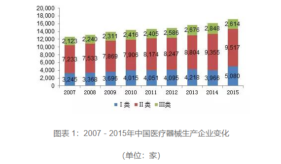 圖表 1:2007-2015年中國醫(yī)療器械生產(chǎn)企業(yè)變化