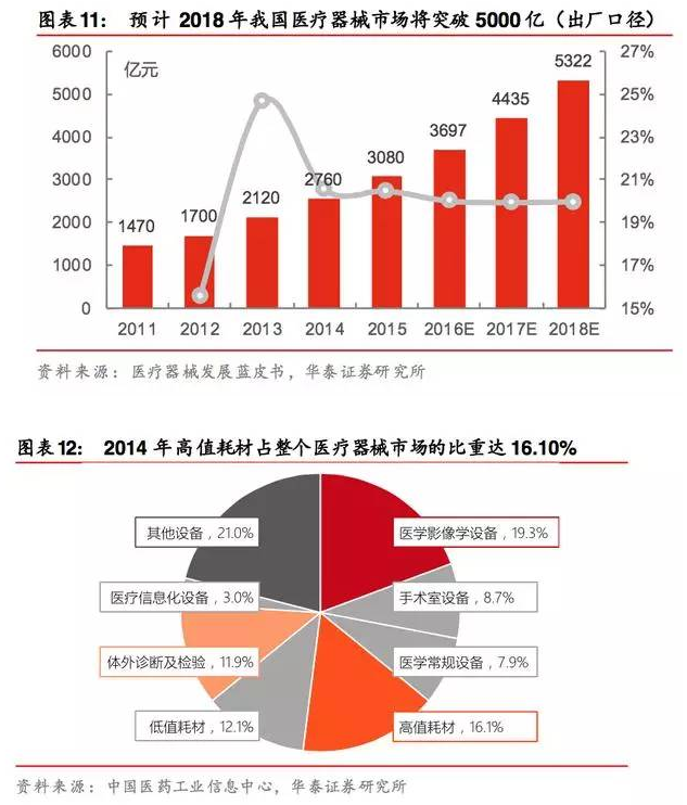 我國(guó)醫(yī)療器械2015年的市場(chǎng)規(guī)模為3080億(出廠口徑),主要分為兩大類(lèi):設(shè)備(醫(yī)用設(shè)備、家用設(shè)備)和耗材(高值耗材,2014年占比16.1%、低值耗材、IVD試劑)。
