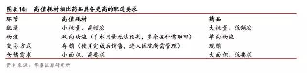 高值耗材的使用個(gè)性化要求高(依患者的具體情況而定),每個(gè)產(chǎn)品所涉及的類(lèi)別及型號(hào) 都非常多(更新迭代也很快),而且直到手術(shù)過(guò)程中才會(huì)確定,所以說(shuō)相比藥品流通,高 值 耗材的 流通配 送專(zhuān)業(yè) 性、壁壘 性更高: 小批量、高 頻次;循 環(huán)反復(fù) 雙向物 流(醫(yī)院 備貨 少,手術(shù)多余品種運(yùn)回);存銷(xiāo)(使用完成后實(shí)現(xiàn)銷(xiāo)售,耗材進(jìn)醫(yī)院后尚需管理)。