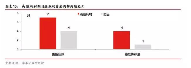 而且相比于藥品,醫(yī)院對(duì)高值耗材的還款周期更長(zhǎng),一般都在 7 個(gè)月以上(長(zhǎng)的有到 1 年 的 ),但 由于高 值耗材 的特殊 性(個(gè)性 化、多樣化 ),使 得經(jīng)銷(xiāo) 商的庫(kù) 存周期 更長(zhǎng),一 般在4 個(gè)月,所以說(shuō)高值耗材流通領(lǐng)域企業(yè)資金的周轉(zhuǎn)周期更長(zhǎng)。