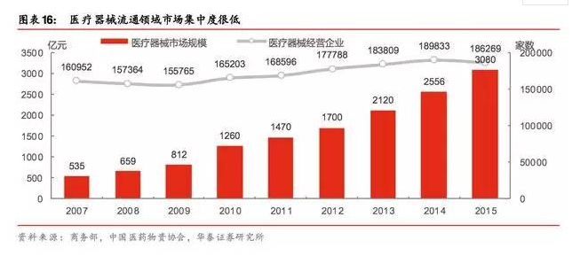 正因?yàn)楦咧岛牟膶?duì)配送的要求更加繁瑣和精細(xì),且對(duì)資金的占用周期更長(zhǎng),使得高值耗材 流通企業(yè)(代理商一般都兼配送的業(yè)務(wù))的服務(wù)能力半徑有限,所以說(shuō)高值耗材流通領(lǐng)域 更加分散,市場(chǎng)集中度更低:整個(gè)醫(yī)療器械 3080 億元的市場(chǎng)充斥著 18 萬(wàn)家經(jīng)營(yíng)企業(yè)(藥 品上萬(wàn)億元的市場(chǎng)規(guī)模也就 1.3 萬(wàn)家經(jīng)營(yíng)企業(yè)參與競(jìng)爭(zhēng)),故整合的空間也更具彈性。
