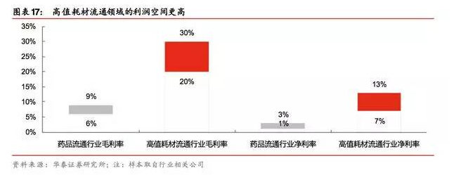 因?yàn)楦咧?耗材的 價(jià)值相 對(duì)更高 ,而且 配送要 求的高 壁壘賦 予流通 企業(yè)一 定的議 價(jià)權(quán),所以 說(shuō)高值耗材流通領(lǐng)域整體的利潤(rùn)率更高:行業(yè)平均毛利率 20%-30%,凈利率 7%-13%, 均顯著高于藥品流通行業(yè),故高值耗材流通領(lǐng)域整合的利潤(rùn)空間更高。