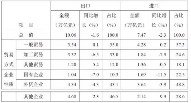 表1. 2016年前三季度中國進(jìn)出口貿(mào)易方式和企業(yè)性質(zhì)情況